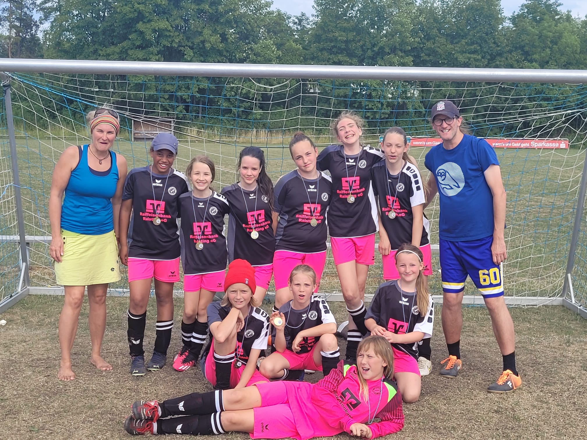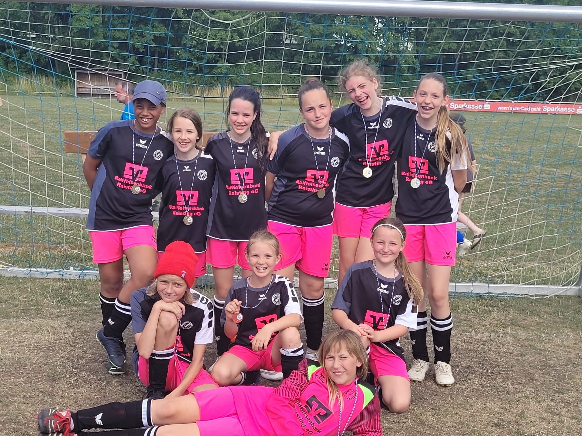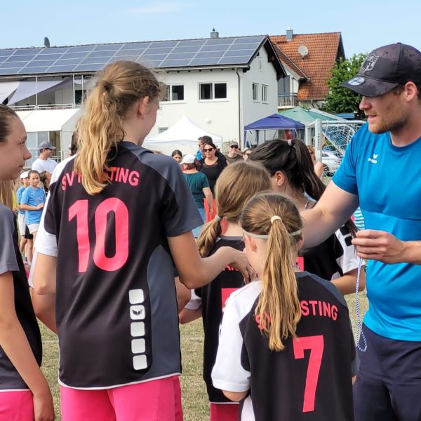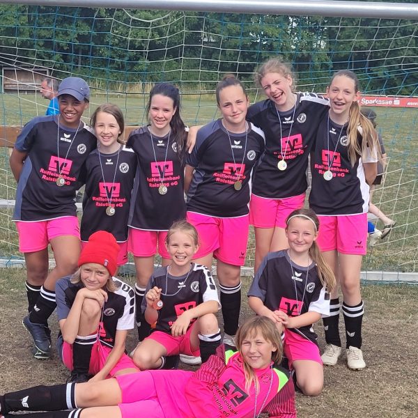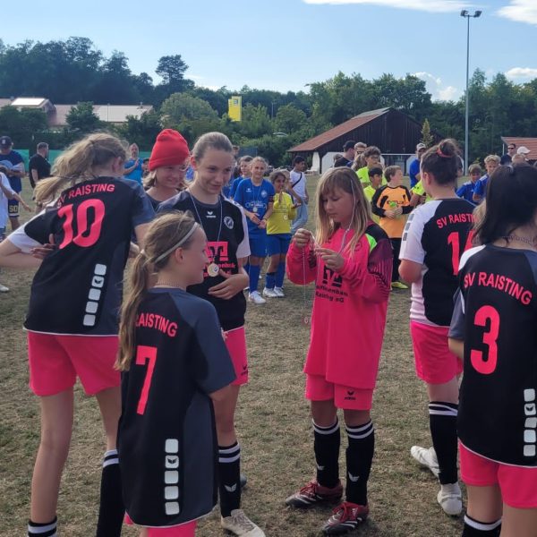 Somit brauchten die Raistingerinnen im letzten Spiel gegen den TSV Türkenfeld ein Unentschieden um den dritten Platz zu sichern. Es war ein dramatisch spannendes Spiel. Zunächst hatte der SVR etwas mehr vom Spiel, dann aber ging Türkenfeld in der 5.Minute nach einer etwas inkonsequenten Team-Abwehrleistung mit 0:1 in Führung. Das heiße Wetter hatte hier wohl für eine kleine Unachtsamkeit gesorgt, die prompt bestraft wurde. Raisting musste nun antworten und tat das auch nach nur einer Minute. Sophia Ludwig erzielte das vielumjubelte 1:1-Ausgleichstor. Da der SVR dieses Ergebnis in der Folgezeit geschickt ins Ziel rettete stand man am Ende auf dem Trepperl – Platz 3 in einem tollen Turnier mit vier ähnlich starken und sportlich sehr fairen Mannschaften.