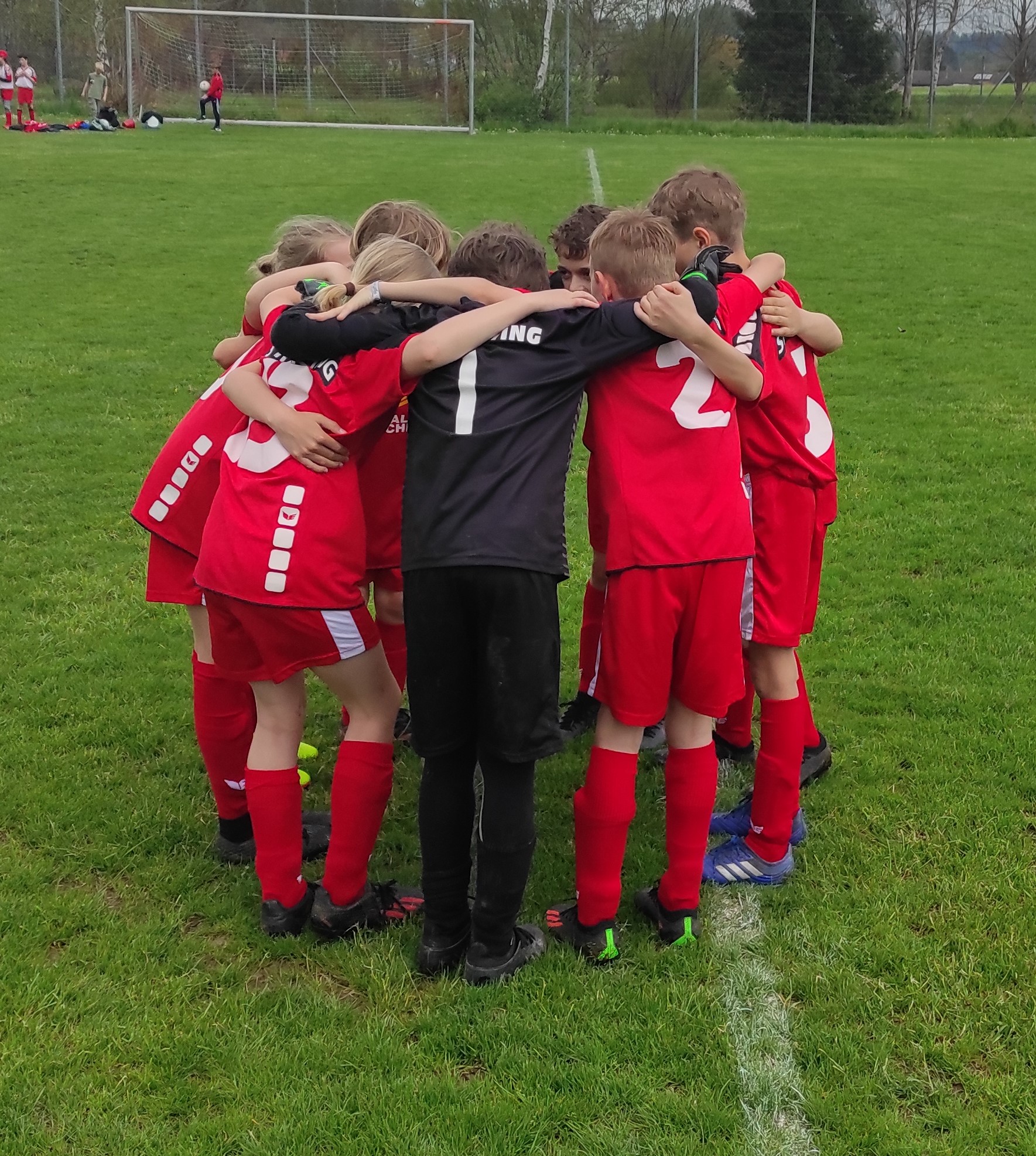 Die roten Teufelinnen und Teufel begannen konzentriert und drängten die Hohenfurcher gleich in die eigene Hälfte zurück. Moritz Schmid gelang bereits mit der ersten zwingenden Aktion das 1:0 in der 2. Spielminute. Als Christoph Falk nur eine Minute später zum 2:0 erhöhte und der Himmel nach anfänglichen Regenschauern sich im schönsten königsblau präsentierte, schauten auch die zahlreich mitgereisten Fans etwas entspannter. Nach dem frühen Rückstand versuchten die Hohenfurcher, die Räume enger zu machen und die Laufwege unserer E2 konsequenter zu stören. Dennoch konnte der Raistinger Kombinationsfußball nicht maßgeblich unterbunden werden. Nach jeweils sehr sehenswerten Ballstafetten trafen Maxi Weinbuch, Moritz Schmid und Niklas Thiel zum zwischenzeitlichen 5:0. Die Trainer der Teams haben sich darauf verständigt, dass Raisting wegen der hohen Führung in Unterzahl mit nur 5 Feldspielern weiter spielt. Hierdurch gelang Hohenfurch der ein oder andere Entlastungsangriff und sorgte dafür, dass unsere Madln und Buam mehr arbeiten und frei gewordene Löcher stopfen mussten. Der in der ersten Halbzeit im Tor weitestgehend ungeprüfte Niklas Titze wurde lediglich durch verunglückte Rückpässe seiner Vorderleute zweimal in Bedrängnis gebracht – Situationen, die er jedoch gut lösen konnte. Die erste Hälfte endete mit vier weiteren Toren. Elias Michl nutzte bei seinem Doppelpack seine Übersicht und Schusskraft zum zwischenzeitlichen 7:0. Maxi Weinbuch erhöhte mit zwei weiteren Toren zum 9:0 Halbzeitstand.