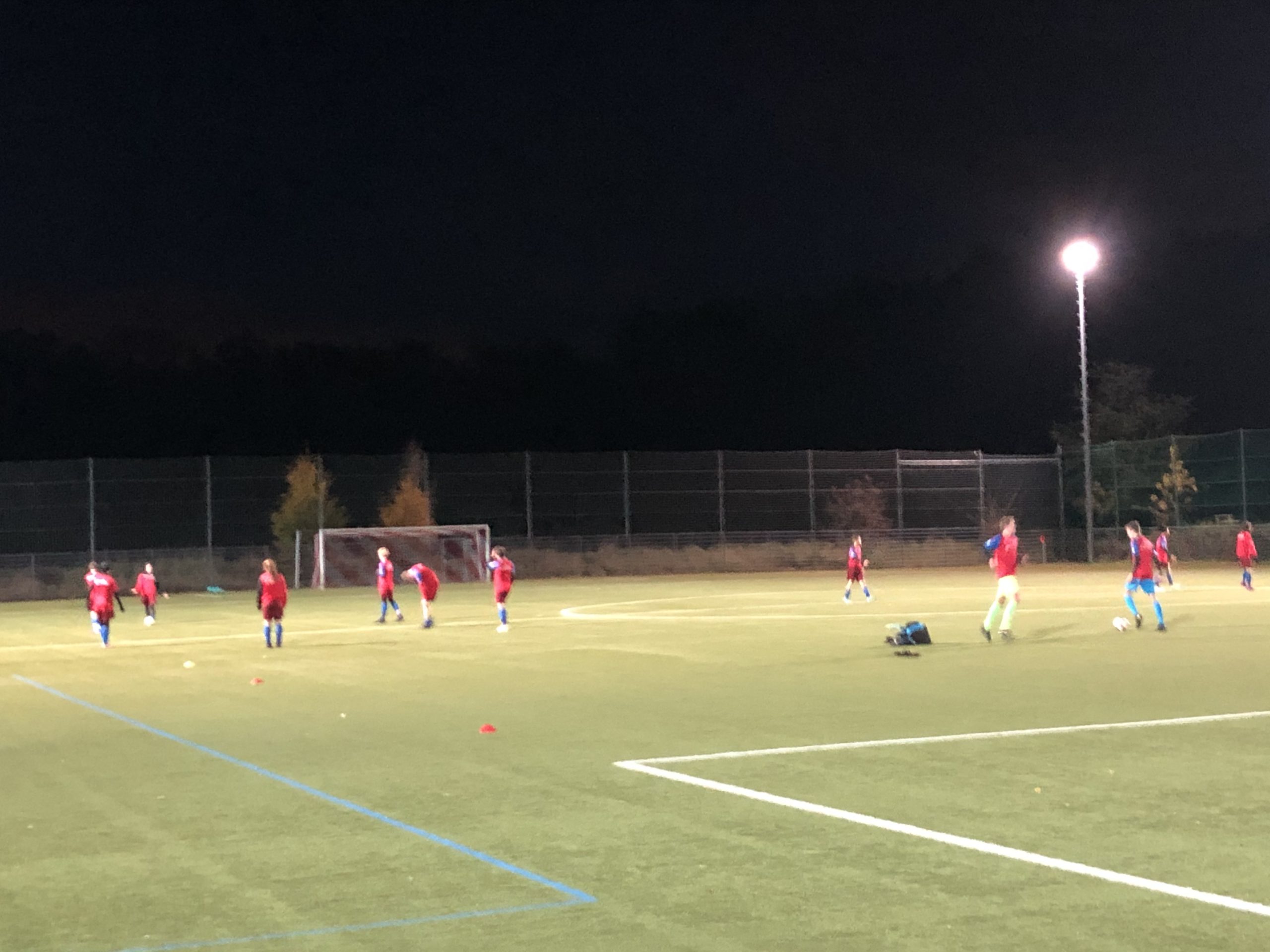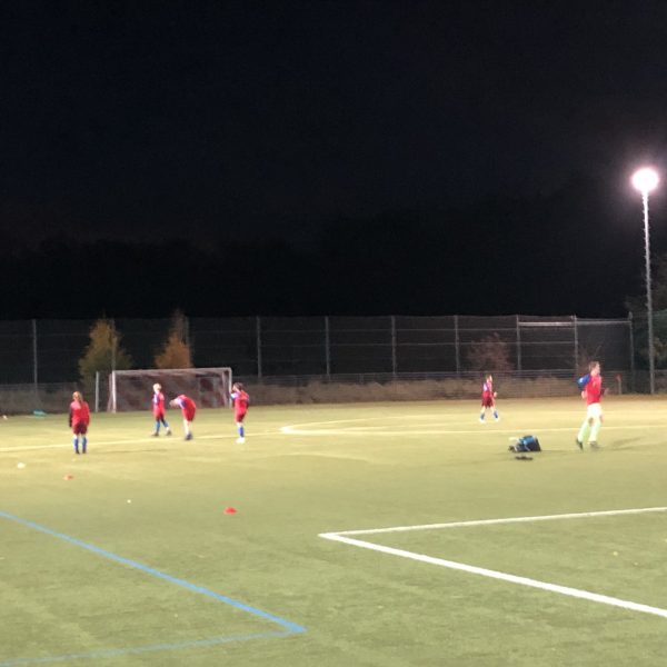 Bei idealen Bedingungen, einem hervorragenden Kunstrasenplatz und Flutlicht starteten wir trotzdem sehr gut in die Partie. Die erste Großchance hatten wir bereits in der 6. Minute durch Jojo, leider verhinderte der Pfosten noch etwas Zählbares. Nur zwei Minuten später konnte der gegnerische Keeper einen Distanzschuss von Paul gerade noch so aus dem linken Kreuzeck fischen. In der 10. Minute war es dann aber endlich soweit und Lenny konnte die selbstlose Vorarbeit von Amelie zum 1:0 verwerten. Kurz darauf musste unser flinker Stürmer aber leider verletzungsbedingt passen und Tom kam früher als geplant zu seinem – wie sich später herausstellen sollte – grandiosen Einsatz. Noch etwas geschockt fingen wir uns kurz darauf die erste verheißungsvolle Chance vom MTV Berg, die aber noch rechtzeitig von Luca zur Ecke geklärt werden konnte. In der Folge fingen wir uns aber wieder schnell und Jojo konnte nach tollem Assist von Jonas die Führung auf 2:0 ausbauen. In der 18. Minute legte Paul sogar noch das 3:0 nach, dass trotz einer dominanten Spielführung und wirklich guten Chancen bis zum Pausenpfiff Bestand hatte.