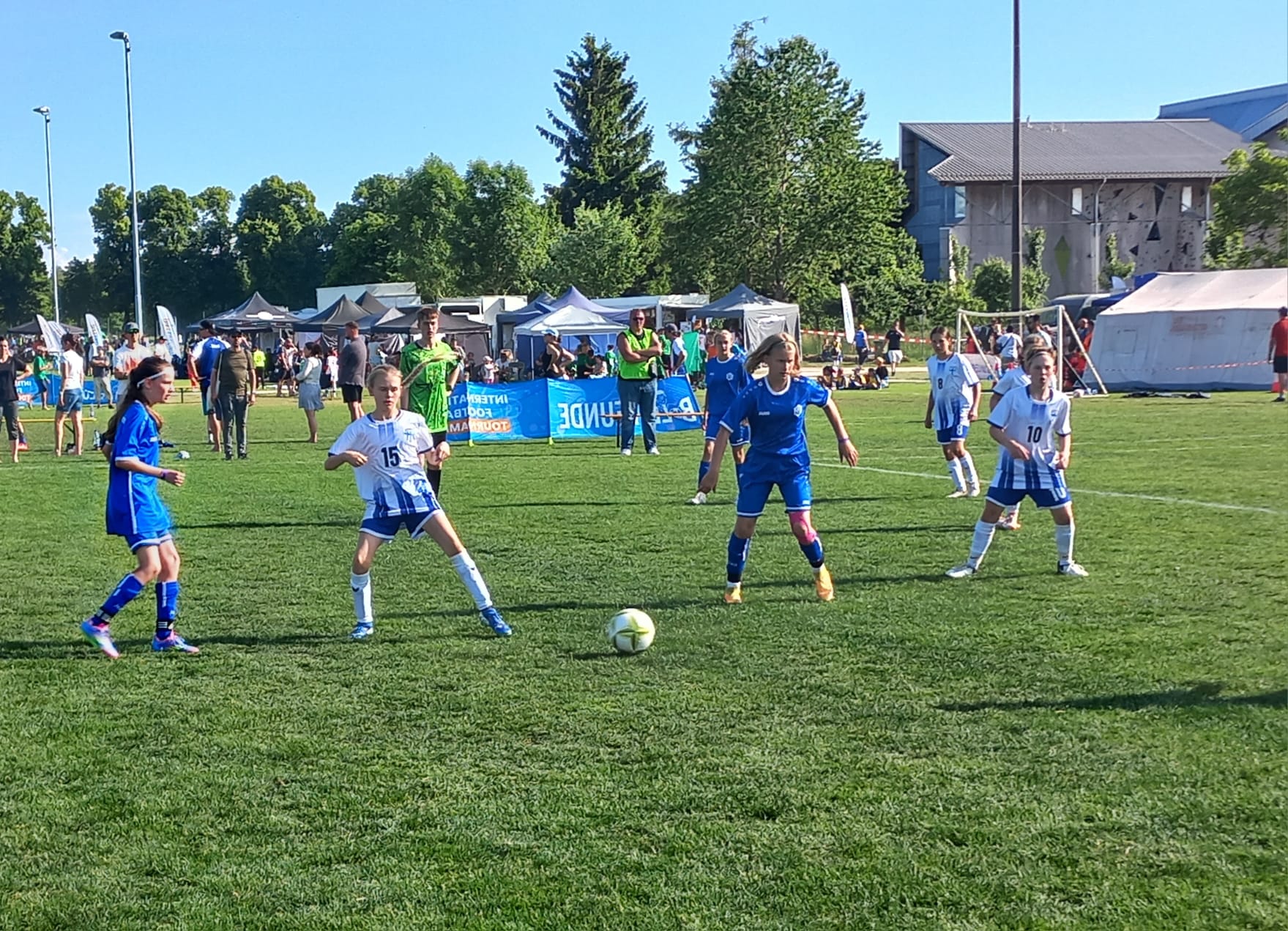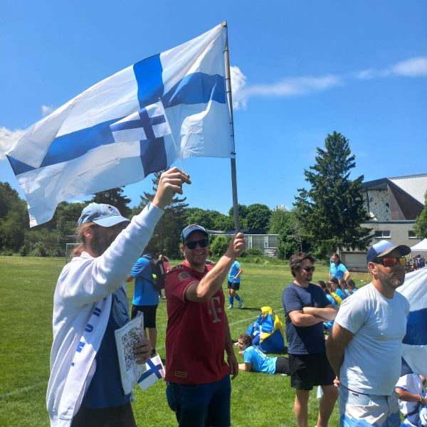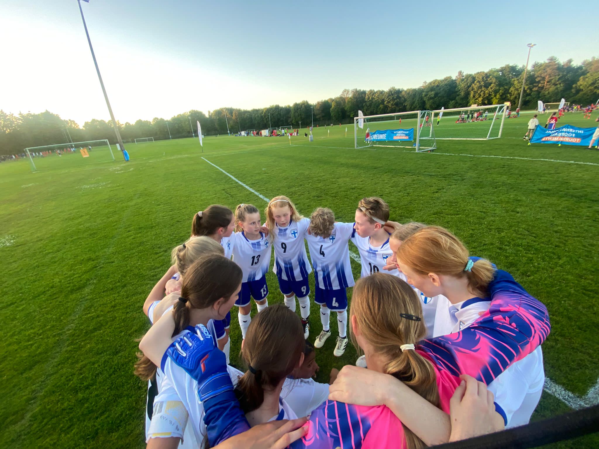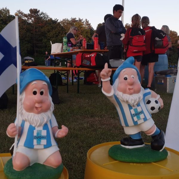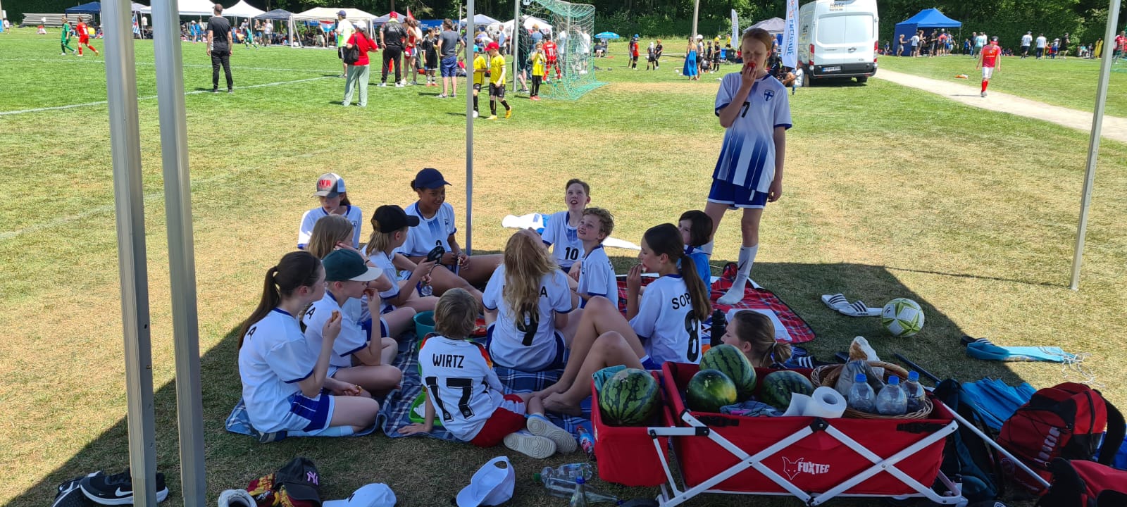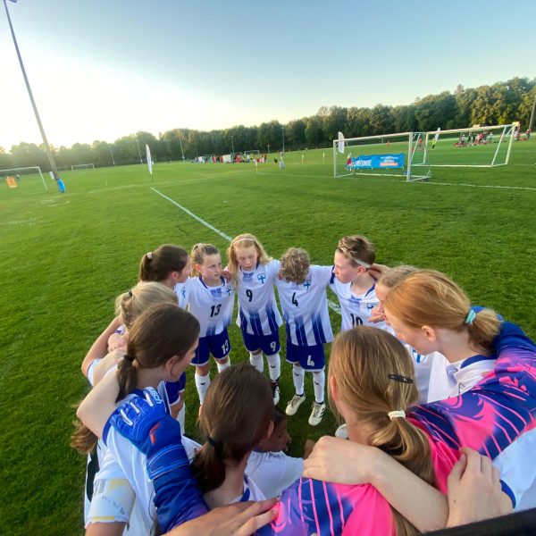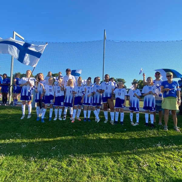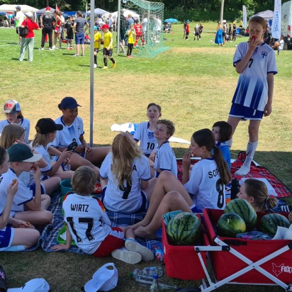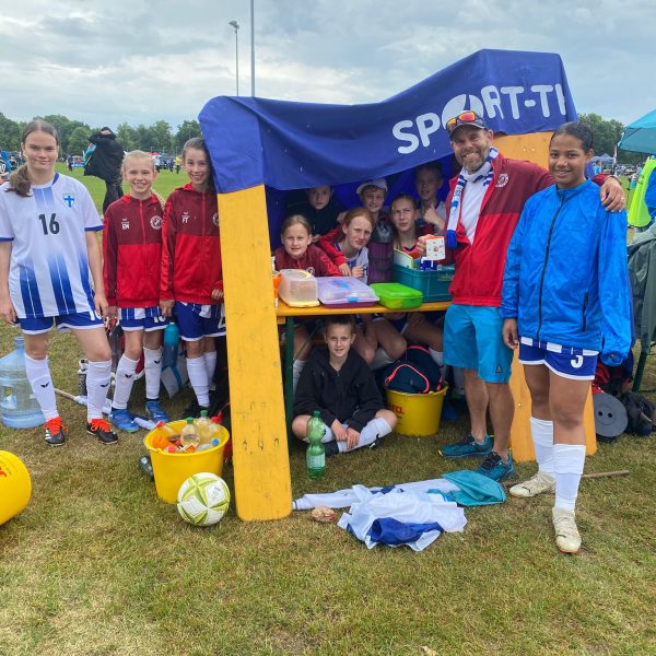 Hochmotiviert startete am 30.05. unsere Delegation vollbepackt Richtung Augsburg. Schon bei der Ankunft konnte man das illustre Teilnehmerfeld erahnen. Auf dem Parkplatz standen schon einige Reisebusse mit der Aufschrift bekannterer Schweizer Fußballvereine. Nach der Ankunft wurde gemeinsam unser Basecamp eingerichtet. Es diente für das Wochenende als Schattenspender, Verpflegungsstation, Chillout Area und Umkleidekabine. Bevor der offizielle Teil mit der Eröffnungsfeier begann, hatte das Trainerteam noch eine kleine Überraschung für die Mädels parat. Da wir bei der Mini-EM das Land Finnland vertreten sollten, wurde ein Satz finnischer Trikots organisiert, samt persönlichem Trikotflock für jede Spielerin. Ein absolutes Highlight für die Mädels! Auch die mitgereisten Fans waren perfekt vorbereitet, Finnlandschals, T-Shirts, Fahnen, alles war perfekt organisiert und vorbereitet. Selbst im Basecamp lief via live Stream der finnische Sender „Radio Rock“. Nach einer richtig stimmungsvollen Eröffnungsfeier, in der alle Teams durch einen Spielertunnel einlaufen durften und vorgestellt wurden, startete unsere Mannschaft am selben Abend noch ins Turnier.