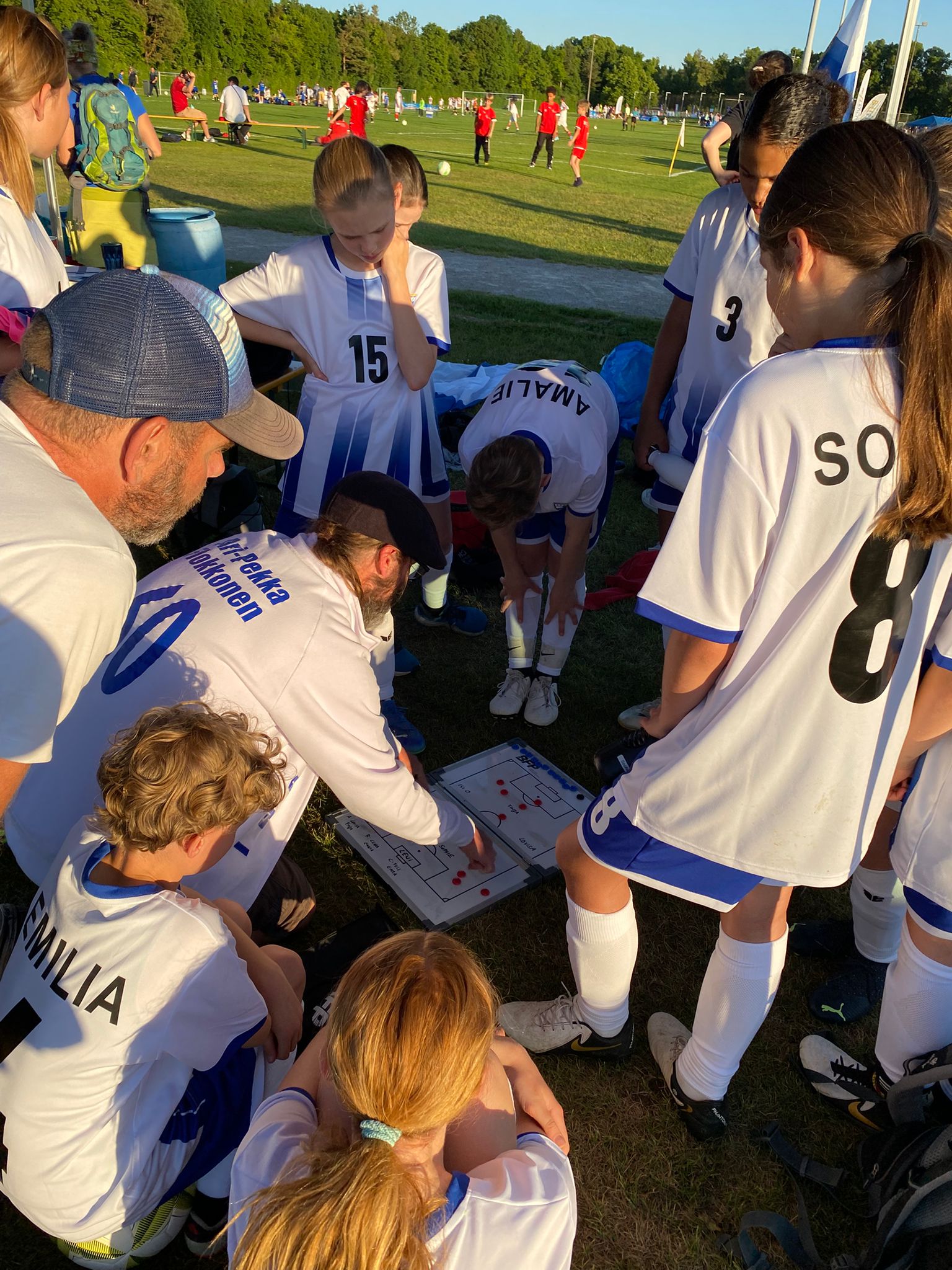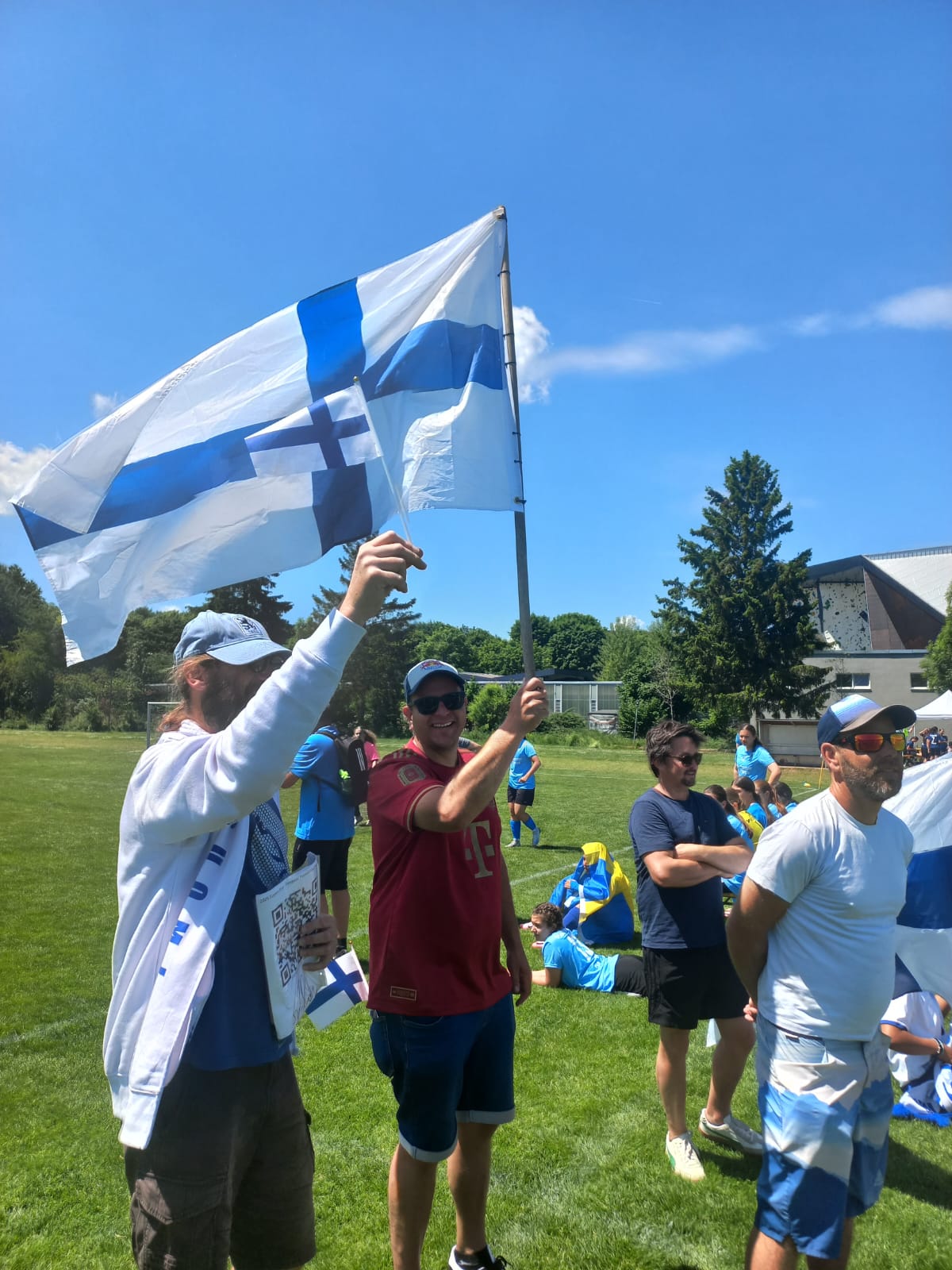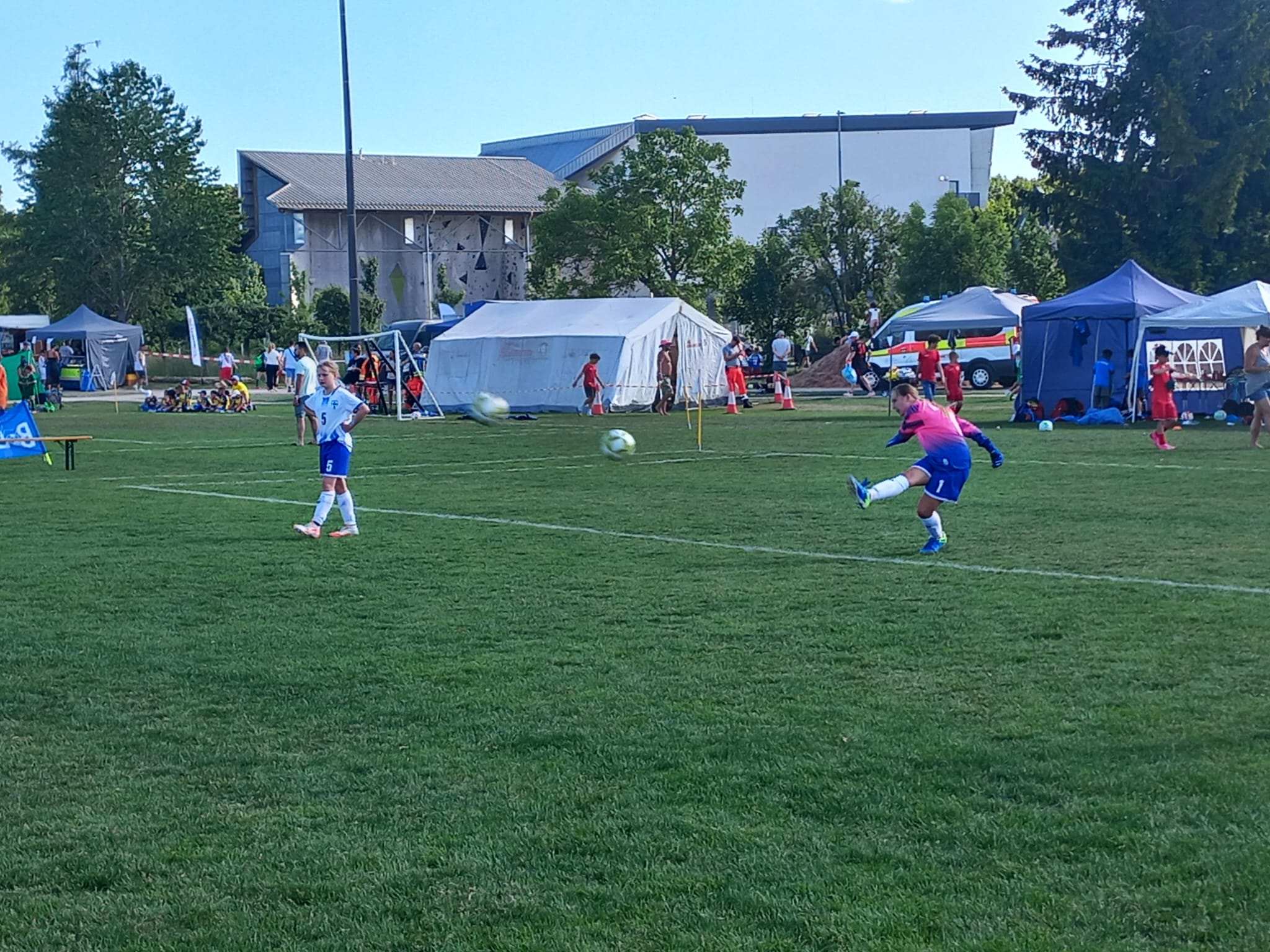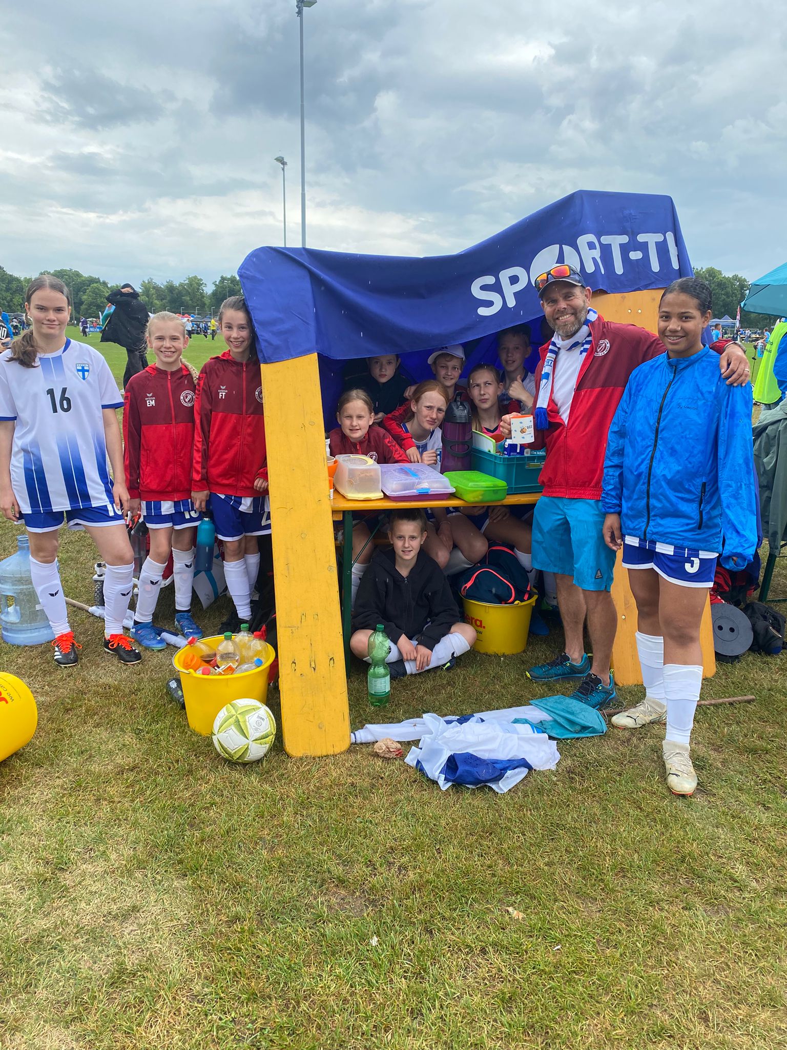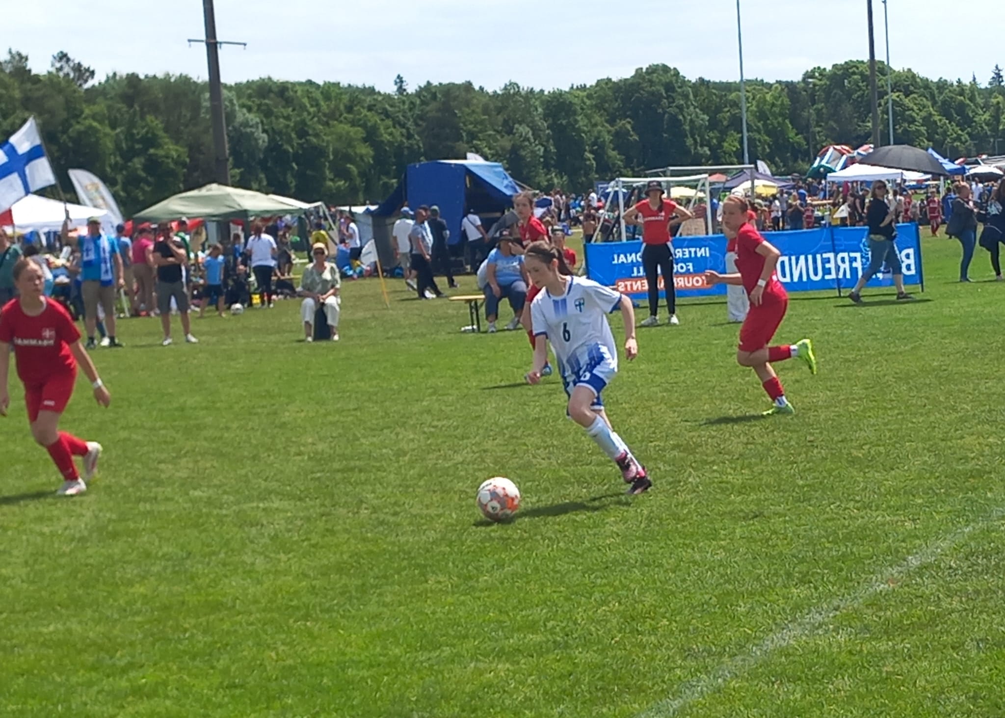 Hochmotiviert startete am 30.05. unsere Delegation vollbepackt Richtung Augsburg. Schon bei der Ankunft konnte man das illustre Teilnehmerfeld erahnen. Auf dem Parkplatz standen schon einige Reisebusse mit der Aufschrift bekannterer Schweizer Fußballvereine. Nach der Ankunft wurde gemeinsam unser Basecamp eingerichtet. Es diente für das Wochenende als Schattenspender, Verpflegungsstation, Chillout Area und Umkleidekabine. Bevor der offizielle Teil mit der Eröffnungsfeier begann, hatte das Trainerteam noch eine kleine Überraschung für die Mädels parat. Da wir bei der Mini-EM das Land Finnland vertreten sollten, wurde ein Satz finnischer Trikots organisiert, samt persönlichem Trikotflock für jede Spielerin. Ein absolutes Highlight für die Mädels! Auch die mitgereisten Fans waren perfekt vorbereitet, Finnlandschals, T-Shirts, Fahnen, alles war perfekt organisiert und vorbereitet. Selbst im Basecamp lief via live Stream der finnische Sender „Radio Rock“. Nach einer richtig stimmungsvollen Eröffnungsfeier, in der alle Teams durch einen Spielertunnel einlaufen durften und vorgestellt wurden, startete unsere Mannschaft am selben Abend noch ins Turnier.