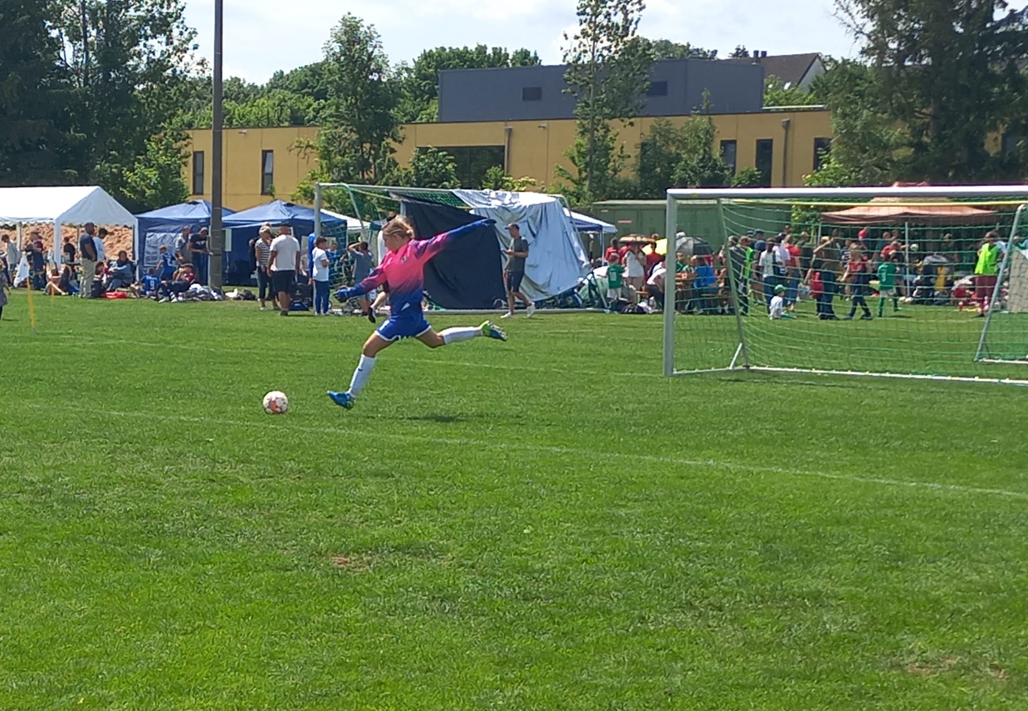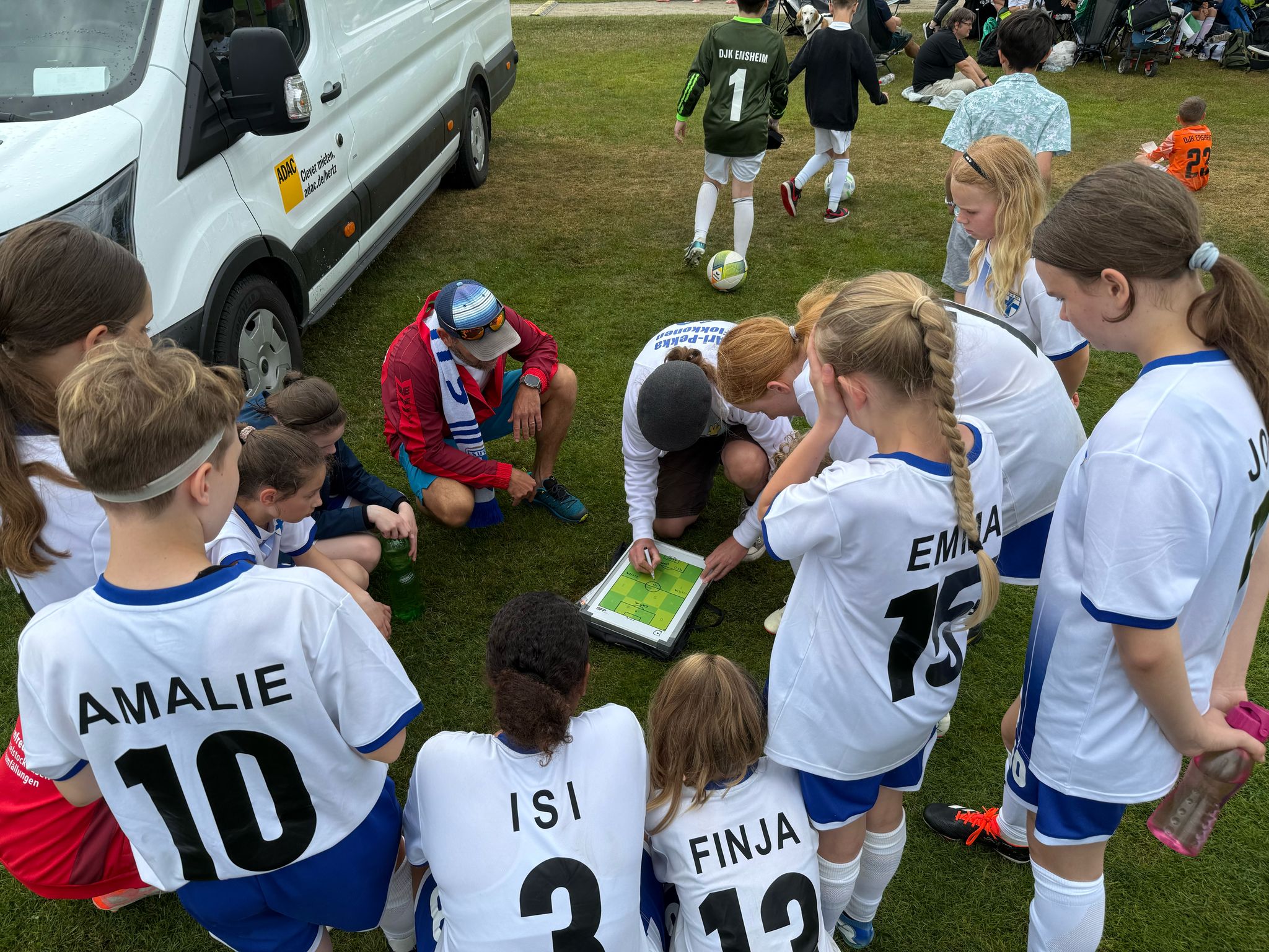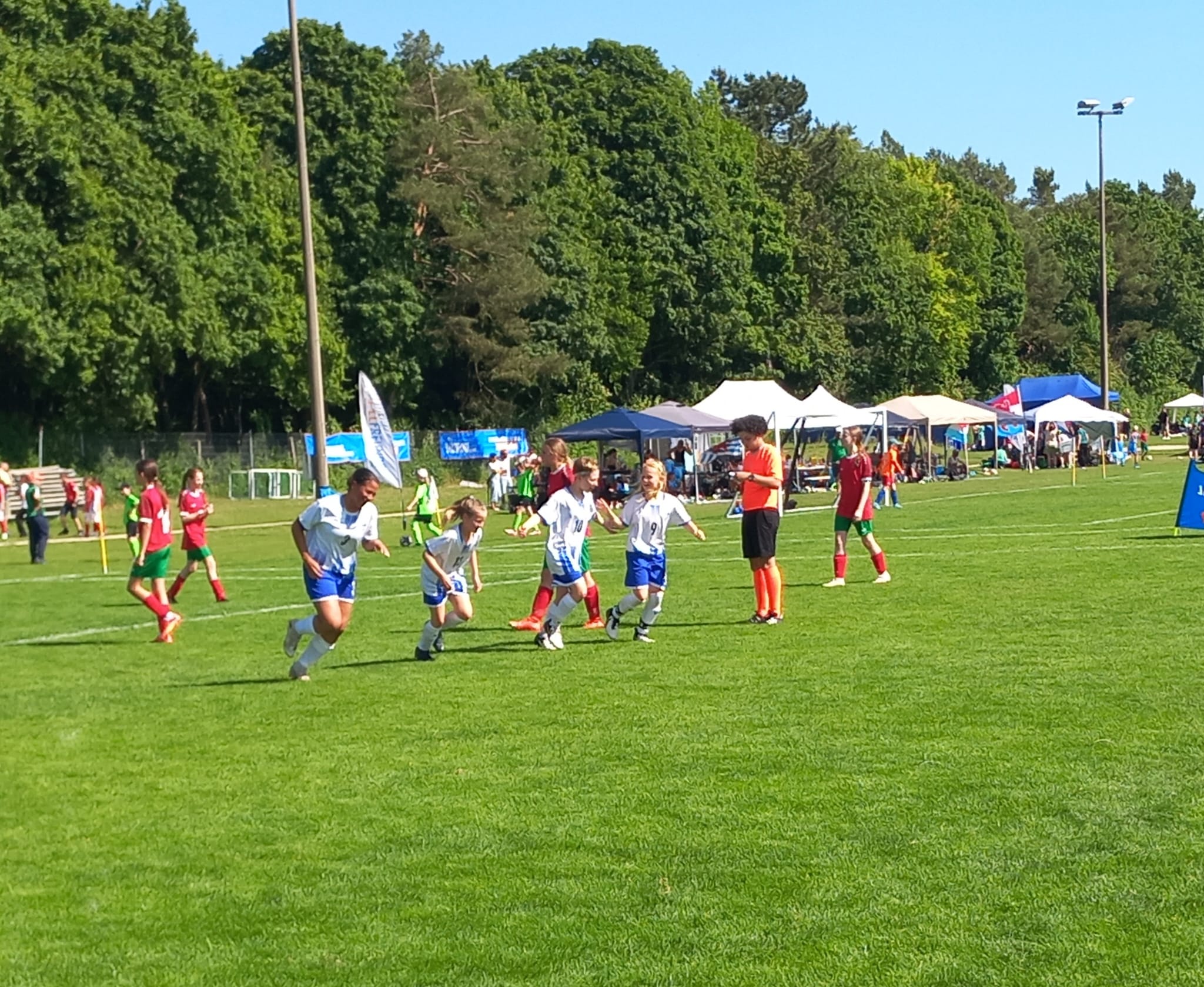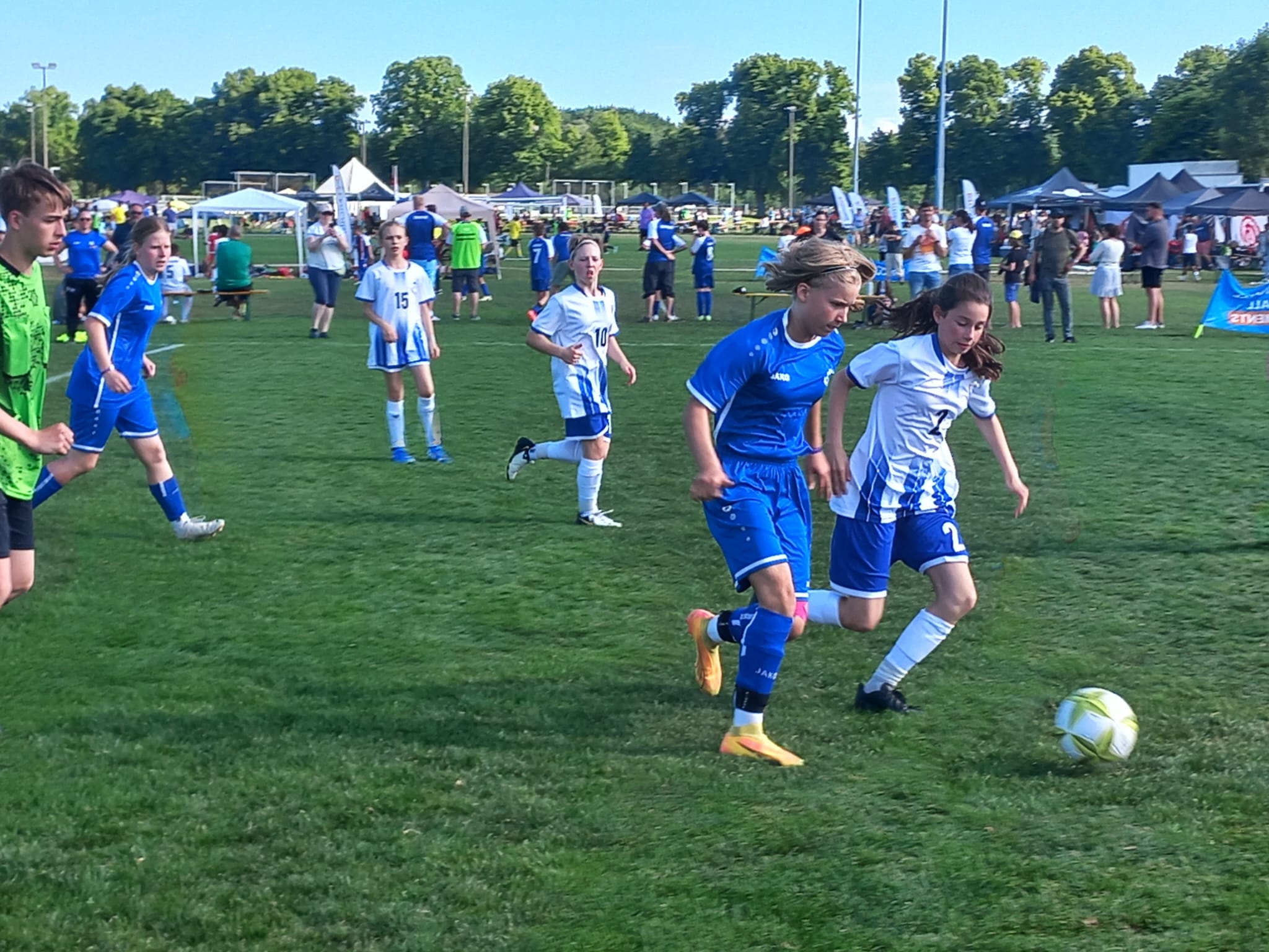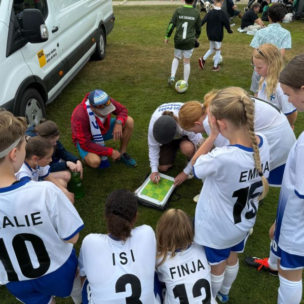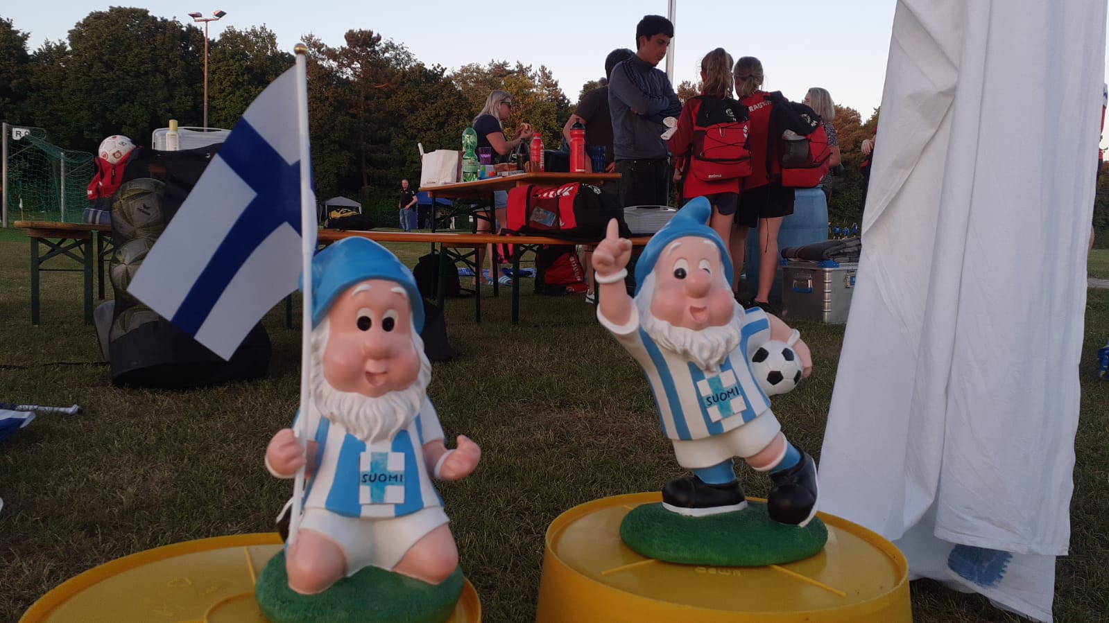 Hochmotiviert startete am 30.05. unsere Delegation vollbepackt Richtung Augsburg. Schon bei der Ankunft konnte man das illustre Teilnehmerfeld erahnen. Auf dem Parkplatz standen schon einige Reisebusse mit der Aufschrift bekannterer Schweizer Fußballvereine. Nach der Ankunft wurde gemeinsam unser Basecamp eingerichtet. Es diente für das Wochenende als Schattenspender, Verpflegungsstation, Chillout Area und Umkleidekabine. Bevor der offizielle Teil mit der Eröffnungsfeier begann, hatte das Trainerteam noch eine kleine Überraschung für die Mädels parat. Da wir bei der Mini-EM das Land Finnland vertreten sollten, wurde ein Satz finnischer Trikots organisiert, samt persönlichem Trikotflock für jede Spielerin. Ein absolutes Highlight für die Mädels! Auch die mitgereisten Fans waren perfekt vorbereitet, Finnlandschals, T-Shirts, Fahnen, alles war perfekt organisiert und vorbereitet. Selbst im Basecamp lief via live Stream der finnische Sender „Radio Rock“. Nach einer richtig stimmungsvollen Eröffnungsfeier, in der alle Teams durch einen Spielertunnel einlaufen durften und vorgestellt wurden, startete unsere Mannschaft am selben Abend noch ins Turnier.