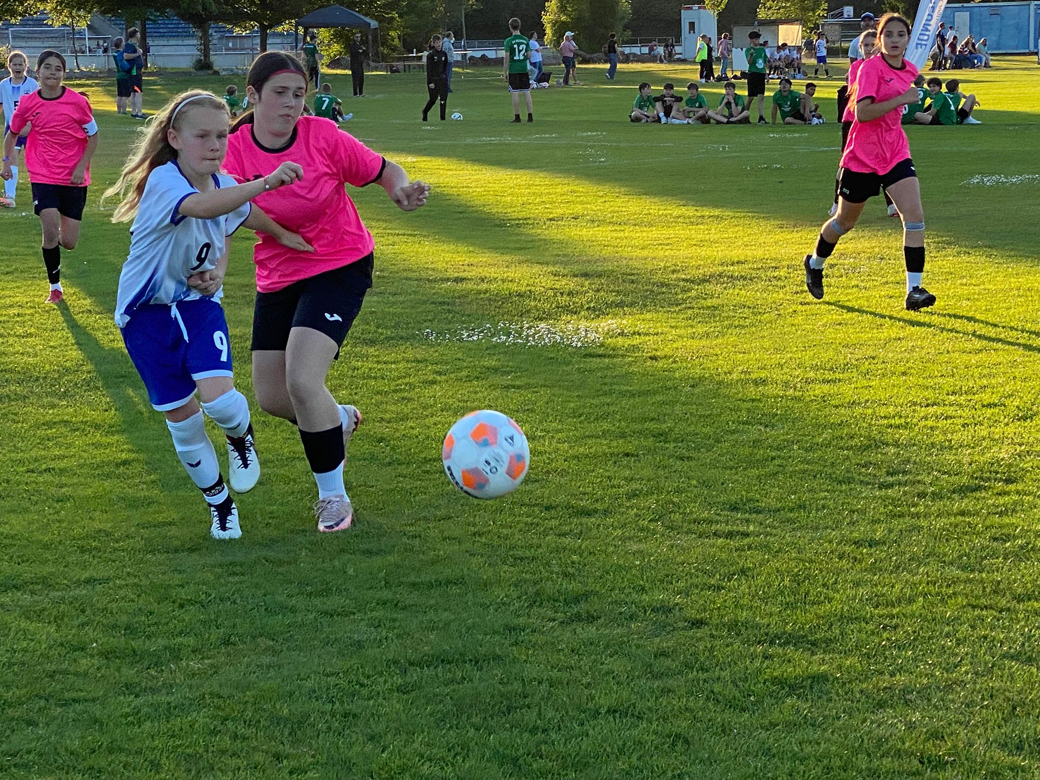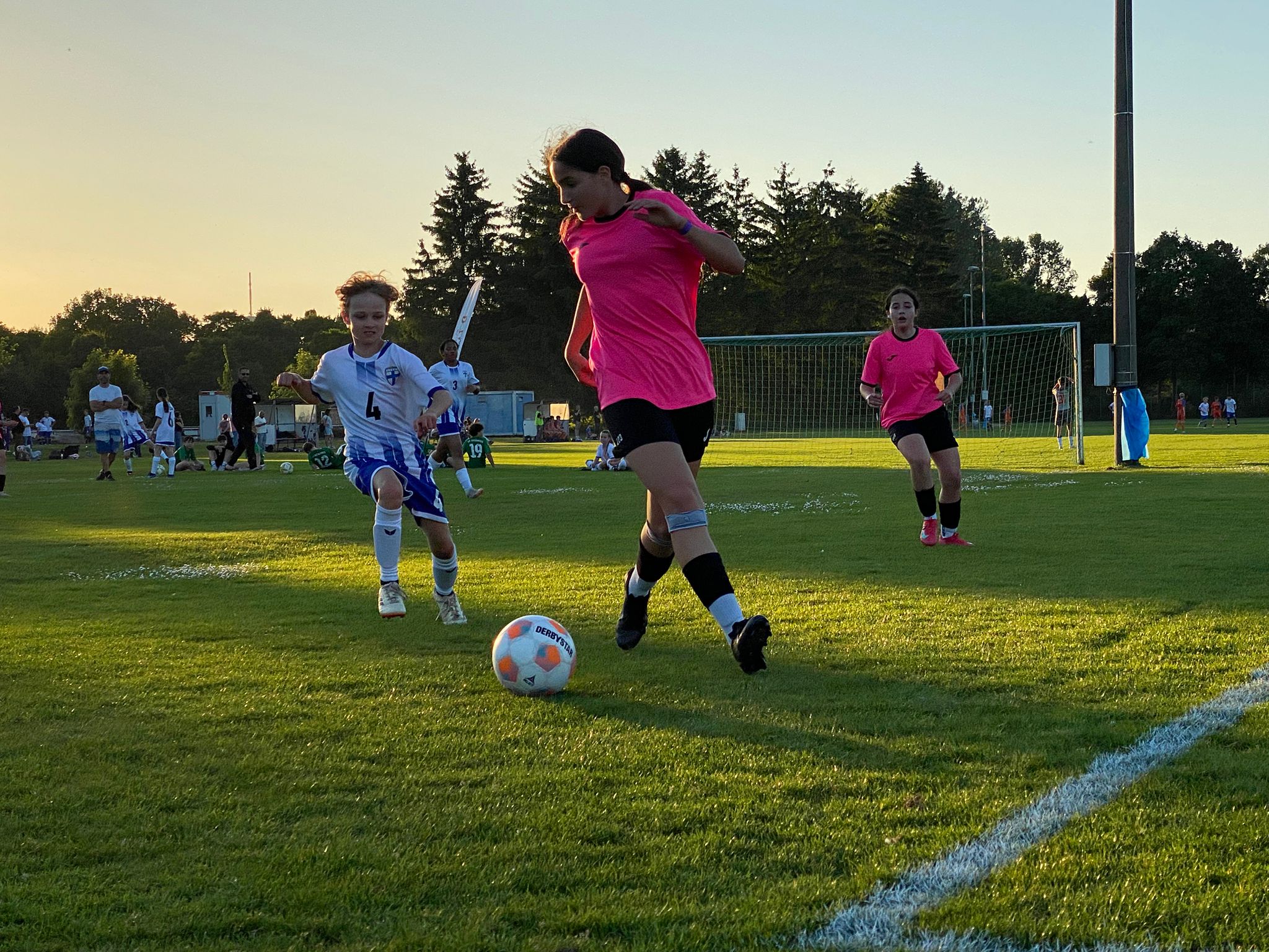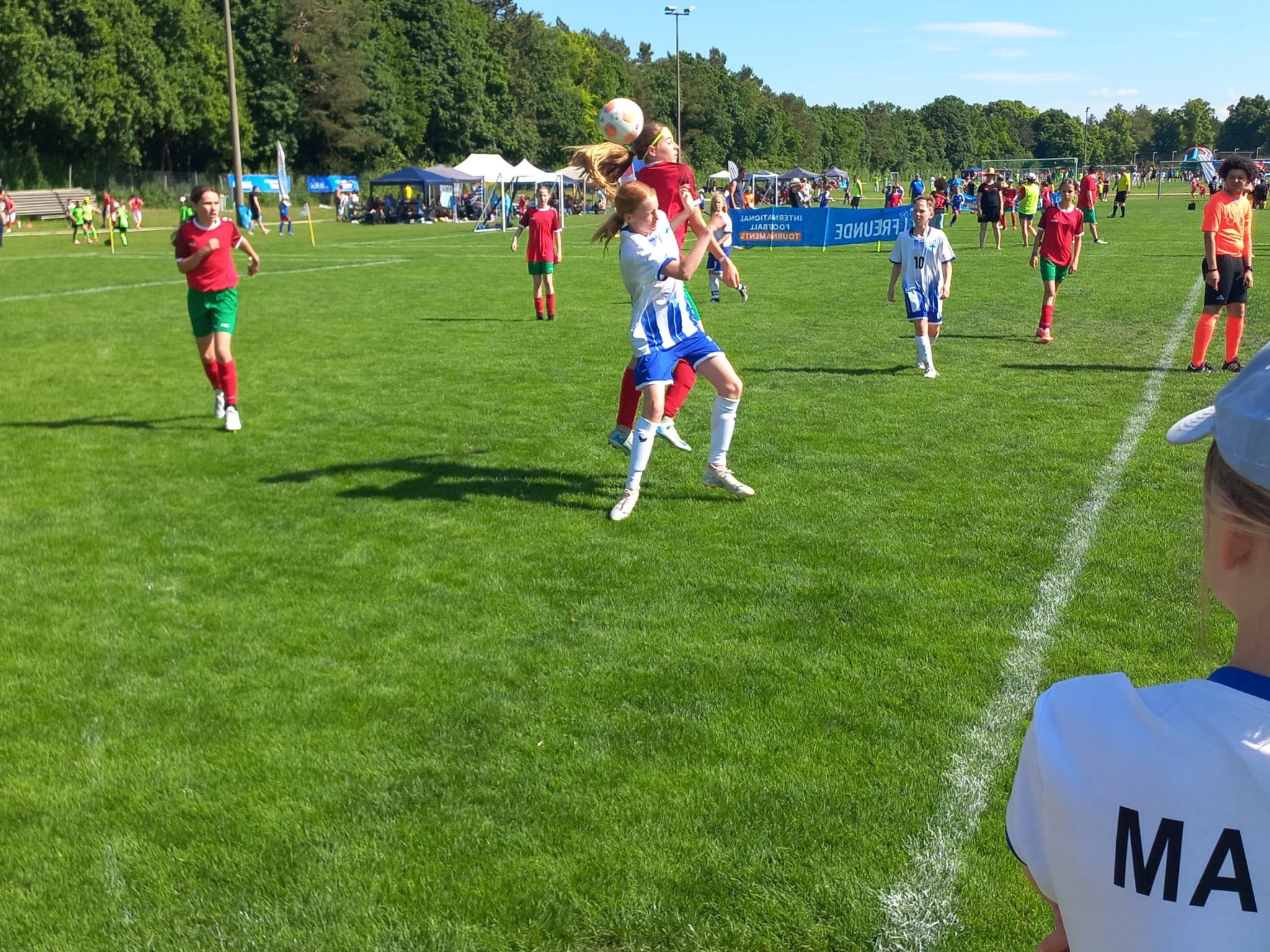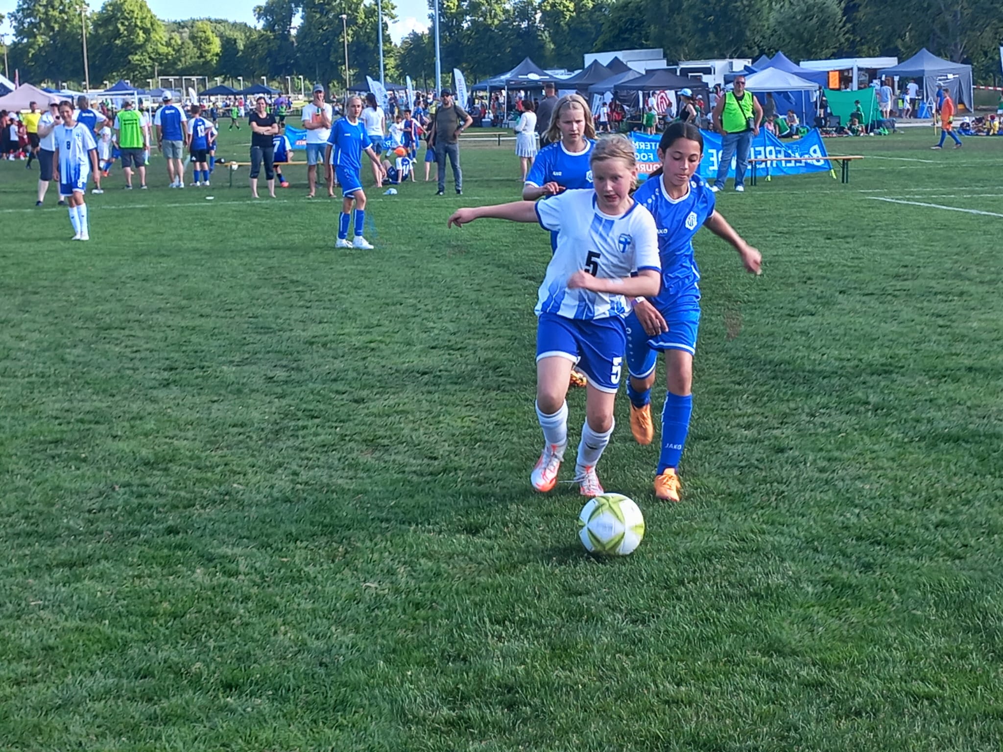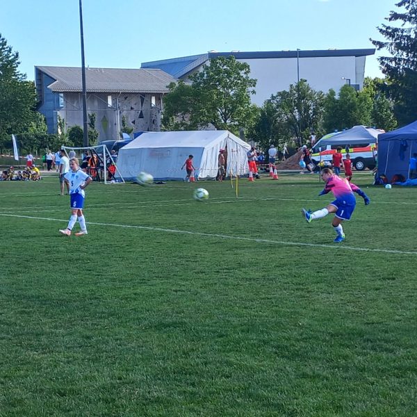 Am zweiten Turniertag griff der SV Raisting-Finnland erst am Nachmittag ins Turniergeschehen ein. Bei brütender Hitze war man froh, das erste Spiel des Turniers bereits in den Abendstunden des Vortages absolviert zu haben. Trotzdem standen drei Spiele auf dem Programm und die Vorfreude war nach dem gelungenen Start groß. Als erstes duellierten sich die D-Juniorinnen mit Island, vertreten durch den FC Bollingen aus der Nähe von Bern. Schnell lagen unsere Mädels mit 2:0 in Führung, welche aber nicht all zulange Bestand hatte. Die gegnerische Mannschaft konnte ausgleichen. Unbeeindruckt dessen kämpften sich die Mädels zurück und fuhren durch einen Viererpack von Amalie Dopfer einen verdienten 4:2 Sieg ein.