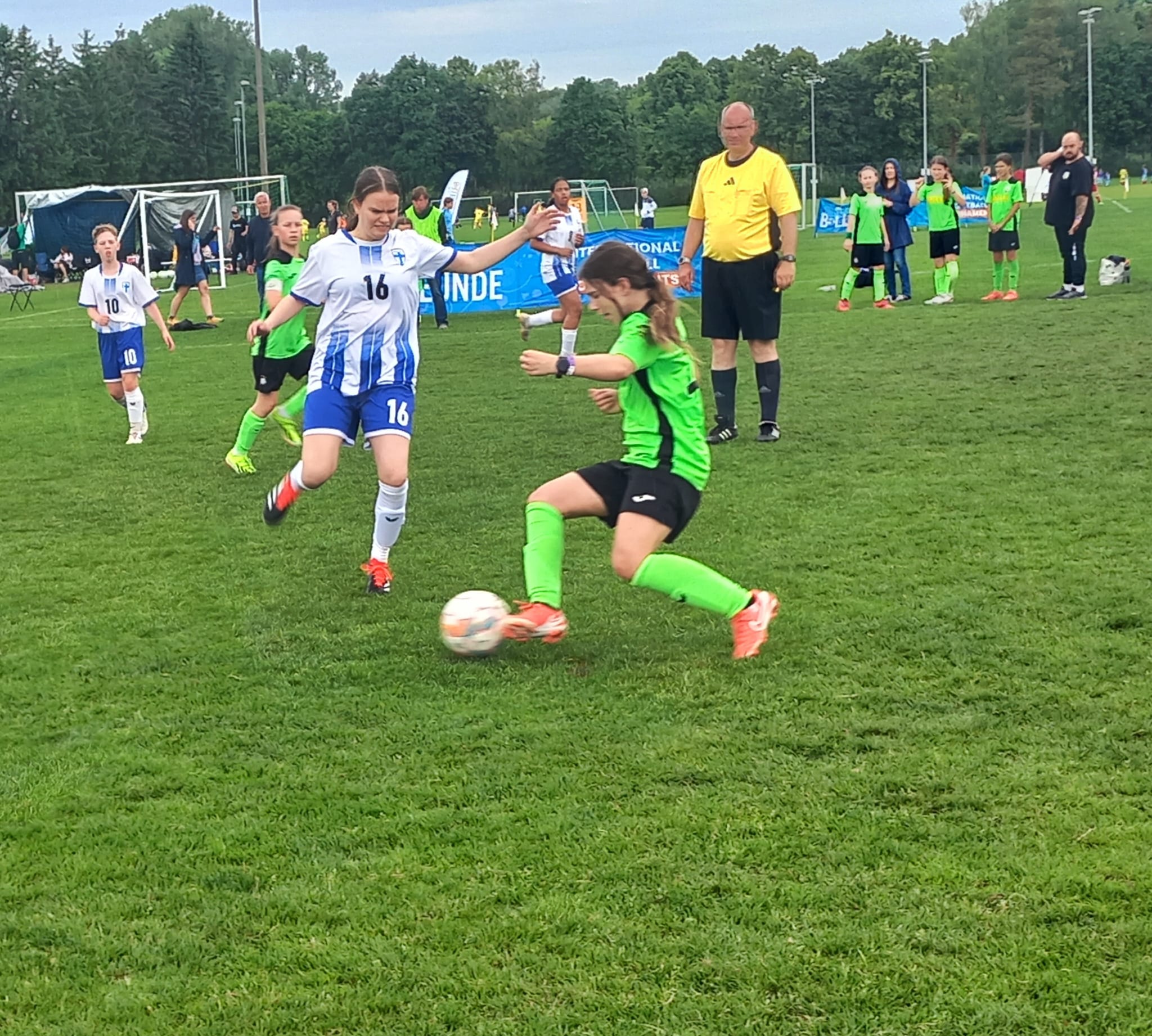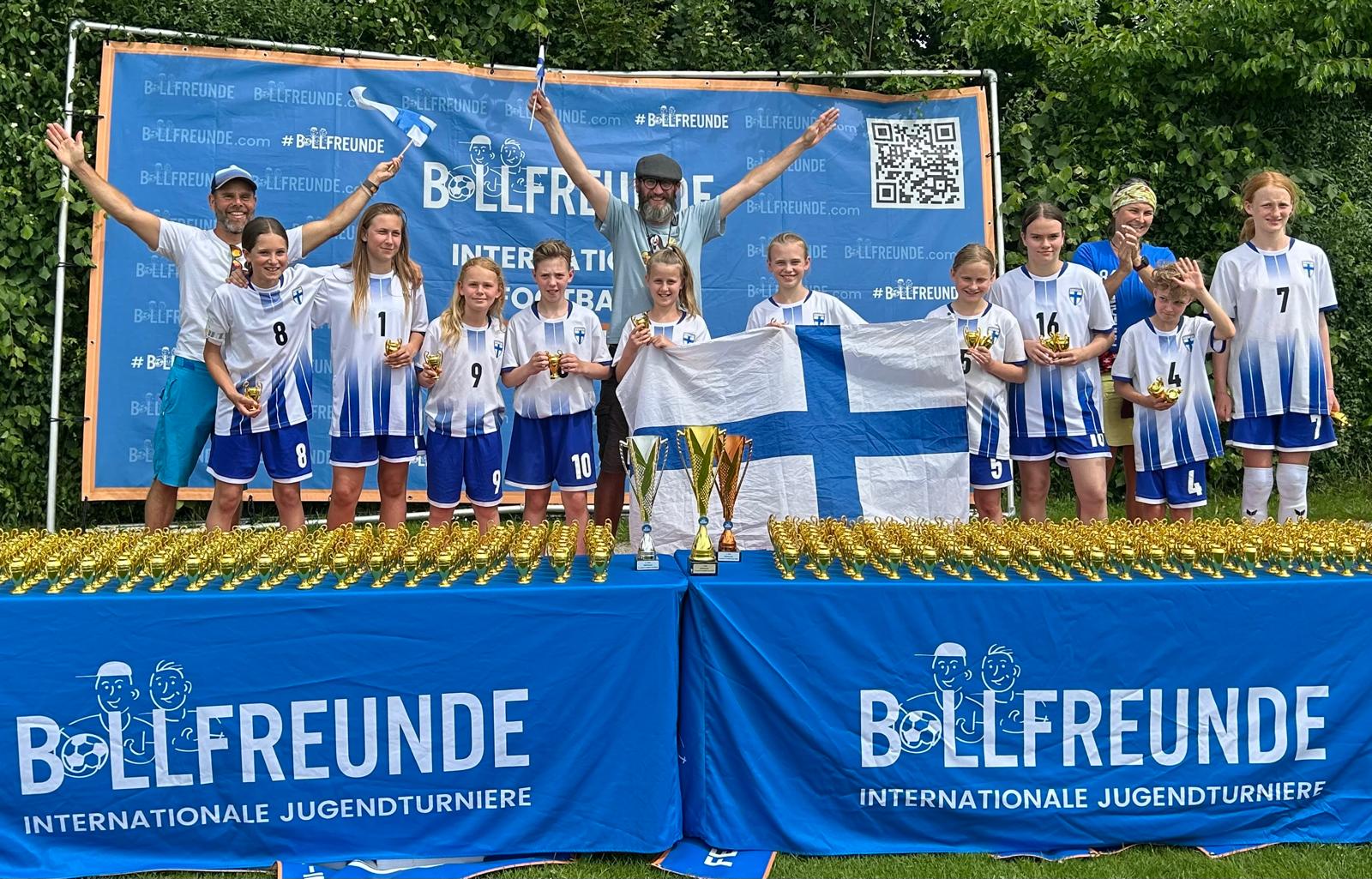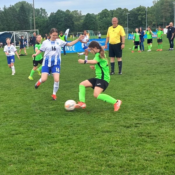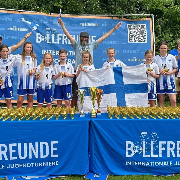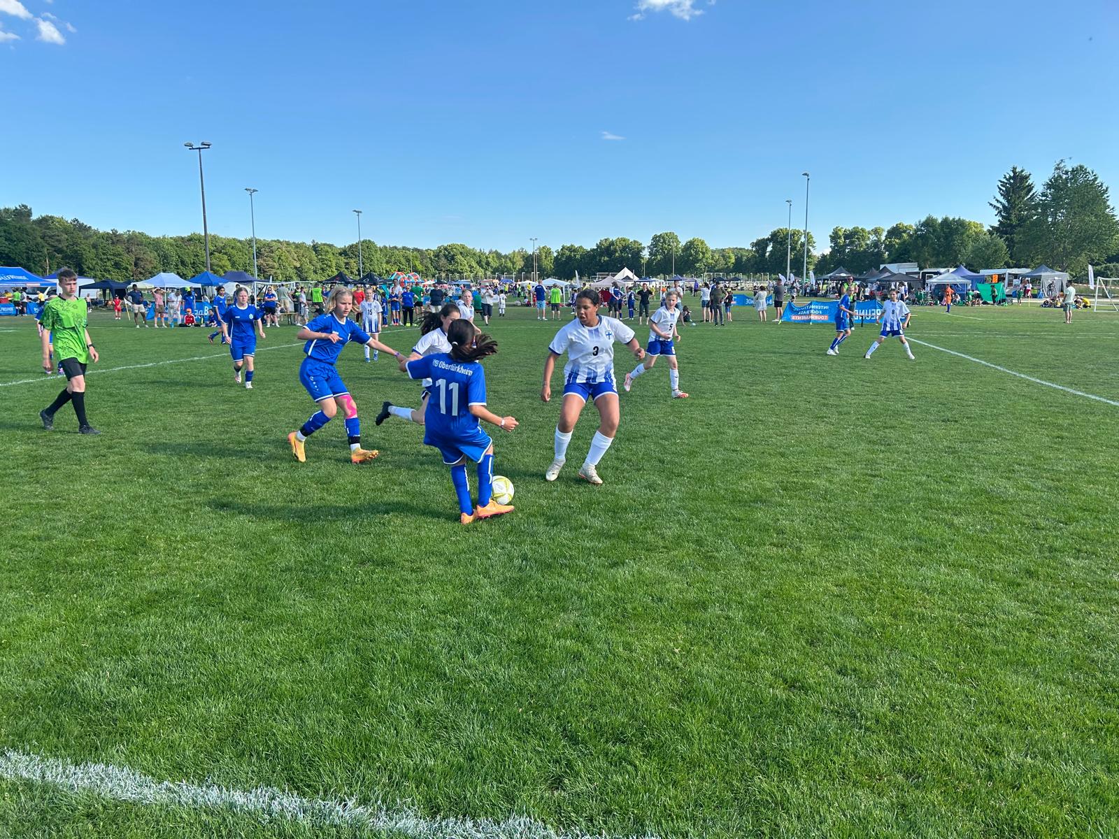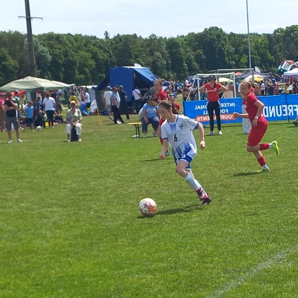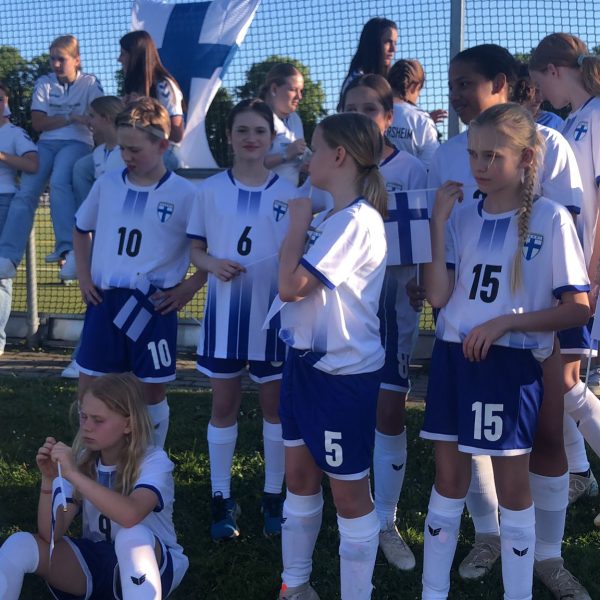 Das Viertelfinale gegen Deutschland, vertreten durch den VfB Obertürkheim aus Stuttgart, war der Höhepunkt des zweiten Turniertages. Vom Trainerteam bestens eingestellt und von den Fans frenetisch angefeuert entwickelte sich ein richtiger Fight ums Halbfinale. Zwei richtig gute Mannschaften standen sich gegenüber. Und unser Team zeigte richtige Nehmerqualitäten. Selbst durch den zwischenzeitlichen Rückstand ließen sich unsere Finninnen nicht unterkriegen und marschierten ein ums andere Mal Richtung gegnerisches Tor. Besonders über die linke Seite um Isabell Onyemaeke wurde das Offensivspiel angekurbelt. Aber auch die Defensivabteilung um Magdalena Merkl und Sophie Schwaiger erledigte ein ums andere Mal ihren Job souverän. Ein erstklassig herausgespieltes Tor durch Clara Rieder, samt Ballstafette und Doppelpass, wurde leider durch den Schiedsrichter wegen einer vermeintlichen Abseitsposition nicht anerkannt. Trotzdem kamen die Mädels noch zum verdienten Ausgleich durch Amalie Dopfer. Doch es sollte leider nicht sein. Quasi mit dem Abpfiff senkte sich eine Bogenlampe unhaltbar hinter unsere starke Torhüterin Leni Gstaiger in den Winkel zum 2:1 Endstand. Die Enttäuschung war riesengroß. So blieben uns noch die Spiele um Platz fünf bis acht, während sich der VfB Obertürkheim am Finaltag zum Turniersieger krönte.