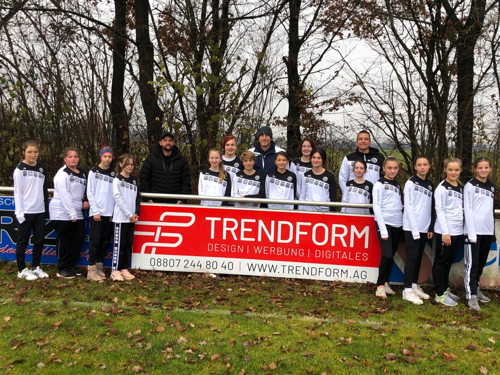 Große Freude bei den Fußballerinnen (C-Juniorinnen) des SV Raisting: Ab jetzt geben die Mädels schon beim Aufwärmen ein gutes Bild ab. Die Firma Trendform GmbH aus Raisting sponserte der Mannschaft, passend zur Jahreszeit, einen Satz Aufwärmtrikots. Die Trainer Dan Evans und Peter Ludwig nahm die Trikots, zusammen mit der Mannschaft, dankend von Daniel Pscheid (Geschäftsführer) in Empfang.
